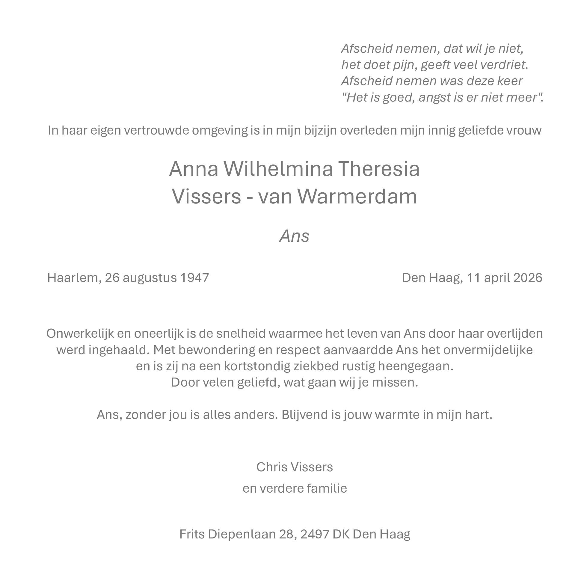 Home » homepage » Ans Vissers – van Warmerdam, 11 april 2026